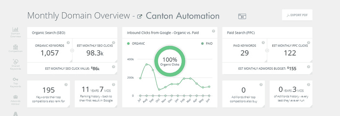 Examine websites current and potential revenue: your website moved up in Google ranking from #22nd to #7. Last months performance: 14K keywords last month. Those new gains added up to about 74K clicks which equate to sales worth of $56,000 last month.